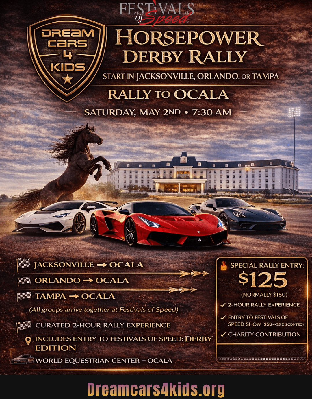 On Saturday, May 2nd, 2026, join Dream Cars 4 Kids for an exclusive rally experience from Orlando OR Jacksonville OR Tampa to Ocala, culminating at the prestigious Festivals of Speed: Derby Edition at the World Equestrian Center.